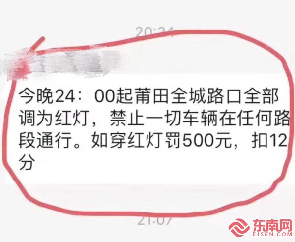 東南網(wǎng)莆田2月6日訊(本網(wǎng)記者 吳炳端)“今晚24時(shí),莆田市全城路口全部調(diào)為紅燈,禁止一切車(chē)輛在任何路段通行,如闖紅燈罰500元,扣12分?!苯裢恚@則消息在莆田本地各微信群流傳。東南網(wǎng)“網(wǎng)絡(luò)求真”記者從莆田市公安局交警支隊(duì)了解到,紅綠燈未調(diào)整,是謠言!